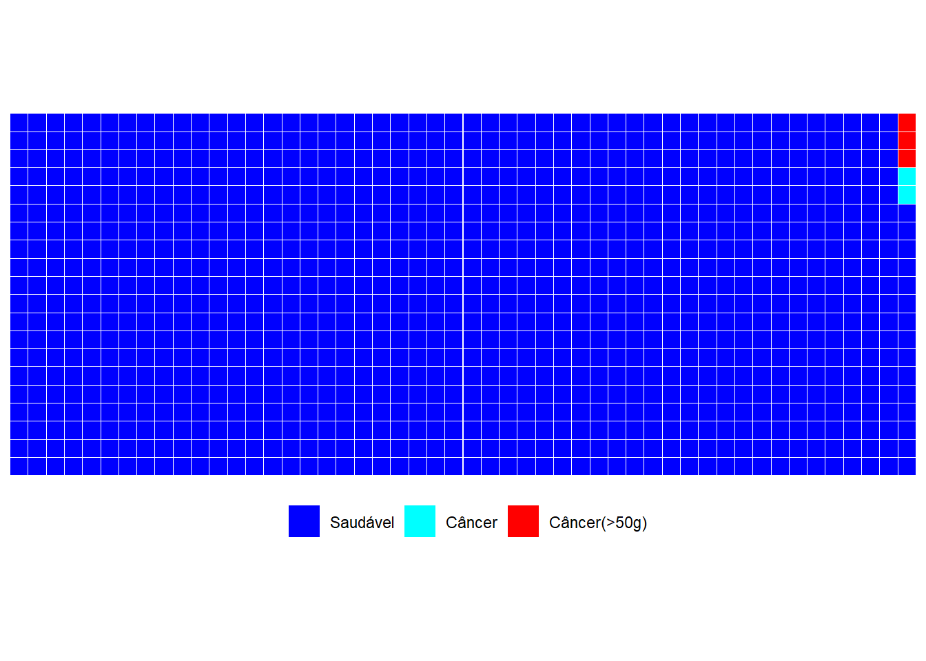 waffle(cancer, rows=10, glyph_size = 6,size=0.1, colors=c("blue","red"),legend_pos = "bottom")Algumas vezes nem no próprio artigo científico original divulga claramente a incidência. Isso ocorre porque é muito comum utilizar, em estudos médicos, um tipo de modelo1 estatístico conhecido como modelo de riscos proporcionais de Cox2. Esse tipo de modelo é utilizado essencialmente pra entender o impacto relativo de diversos fatores no risco de desenvolver alguma doença. Como é relativo, não é necessário explicitamente saber a incidência. Porém, geralmente, “escondido” em algum lugar do texto, é possível extrair essa informação.