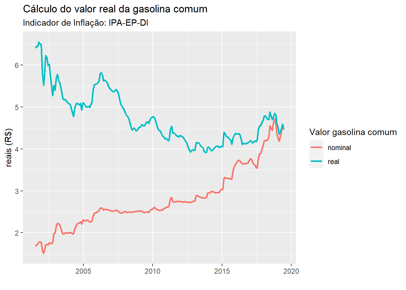 gg.salPara chegar ao preço real \(PR_t\) no tempo \(t\) de um commodity com valor nominal \(PN_{t_0}\) no tempo \(t_0\), basta usar a seguinte fórmula: \[PR_t = \frac{PN_{t_0}}{INF_{t-t_0}},\] onde \(INF_{t-t_0}\) indica a inflação acumulada no período de \(t_0\) a \(t\) (nesse caso com referencial sendo o tempo t). Aplicando a mesma lógica para o preço do litro da gasolina comum como vemos na figura 2, o preço nominal da gasolina comum em Julho de 2001 era de R\$ 1,68, porém descontando a inflação, o valor real é de R\$ 6,40 em Junho/2019. Como o valor nominal da gasolina comum em Junho/2019 é de R\$ 4,46, podemos dizer que nesse período houve uma desvalorização de 30% com relação a inflação (utilizando o indicador IPA-EP-DI como referência). Ou seja, o litro da gasolina comum hoje é mais barato do que era a 19 anos.