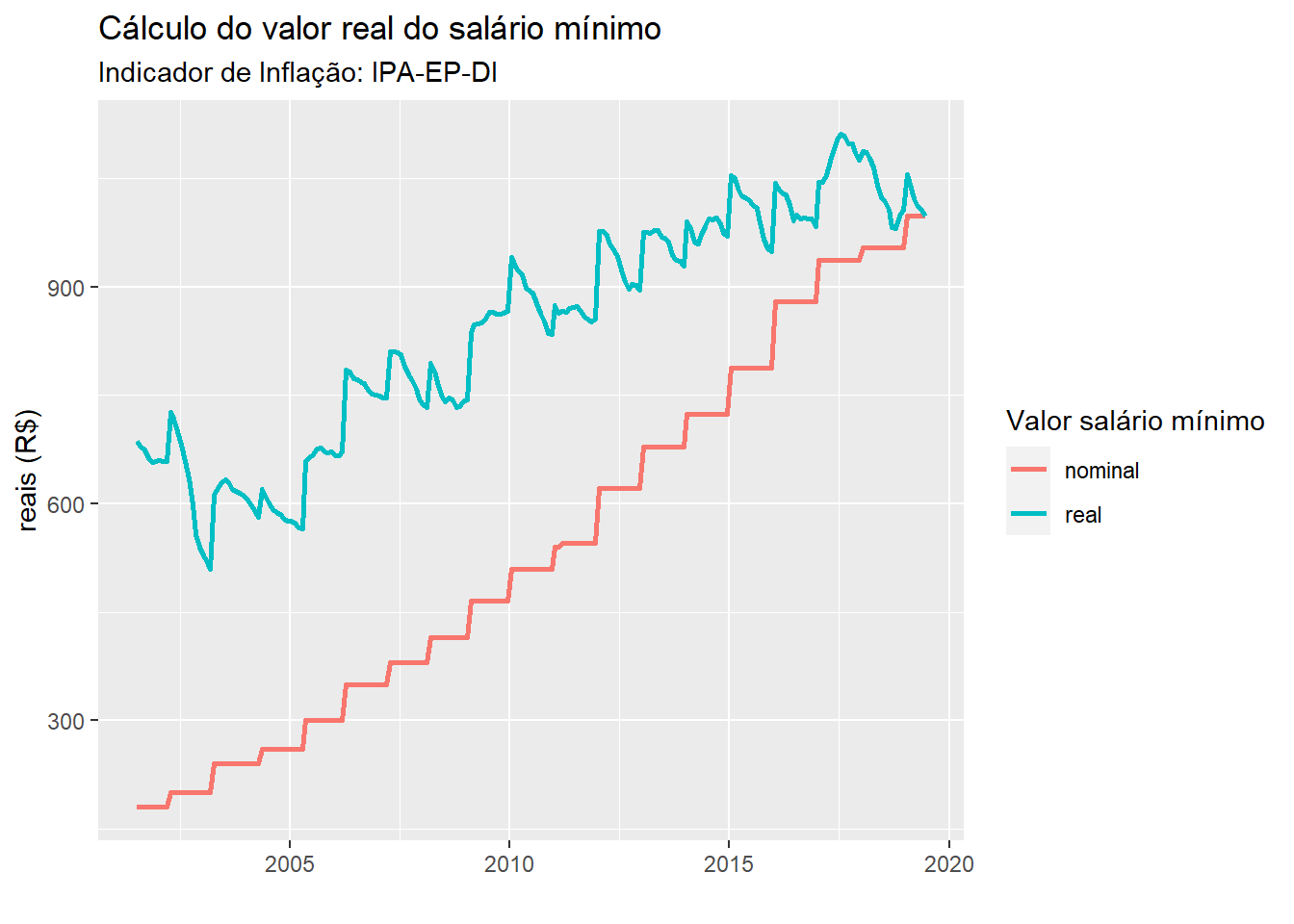 gg.sal <- gg.sal + labs(title = "Cálculo do valor real do salário mínimo",