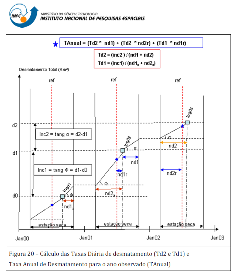 No relatório com a metodologia para o cálculo das taxas anuais, o segundo passo é descrito de forma bastante superficial. Mostra-se apenas um caso específico, onde todas as datas de referência e as imagens de satélites utilizadas estão dentro dos períodos de seca. Não entrarei em detalhes aqui, porém existem vários outros cenários possíveis. Especificamente, o relatório diz na página 30 que: