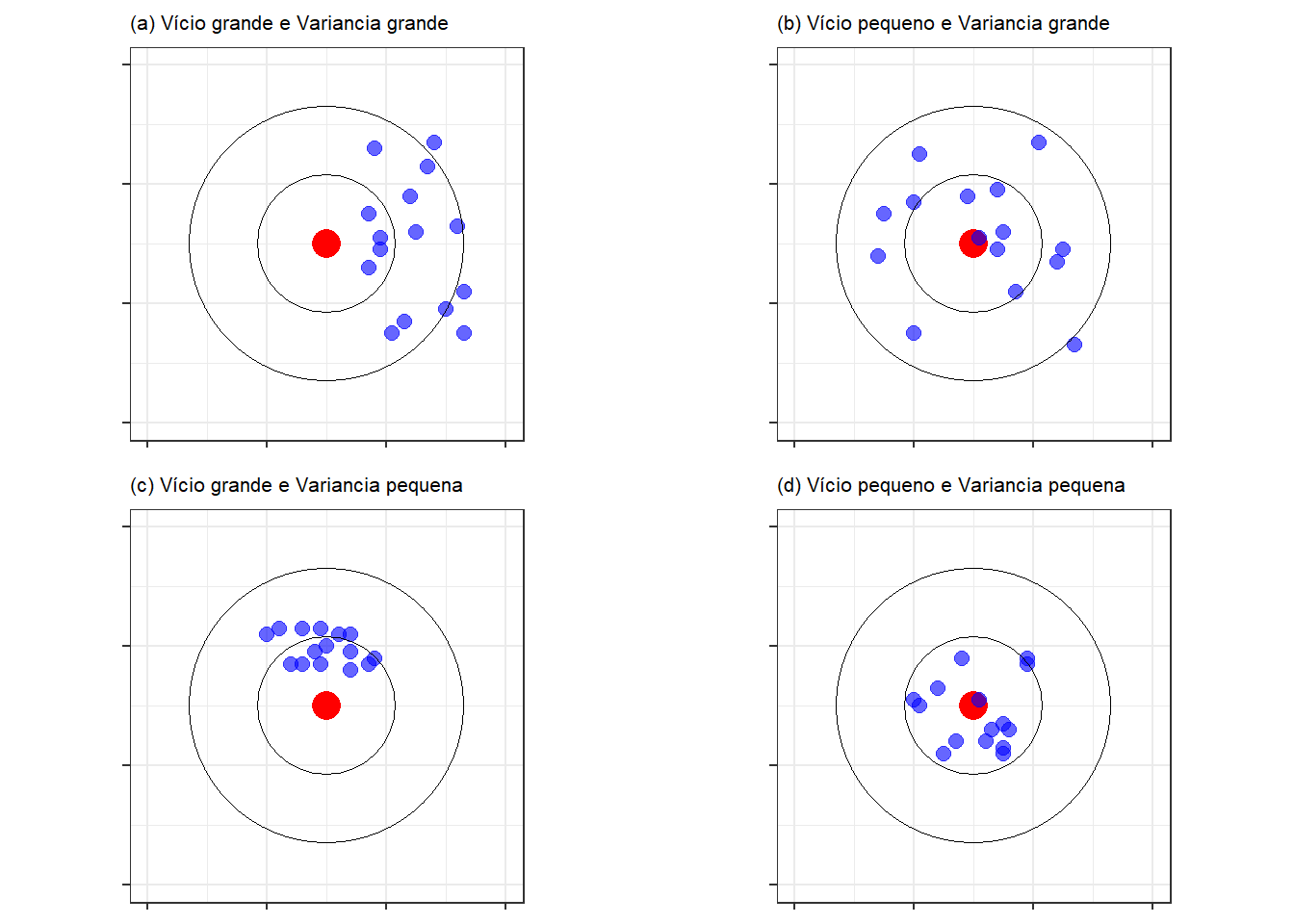 O ideal é que o estimador tenha um vício pequeno, ou seja, que em média ele acerte o valor do parâmetro populacional, e que tenha uma variância pequena, ou seja, que os diferentes valores que o estimador assumiria em cada possível amostra não sejam muito diferentes uns dos outros. A maneira mais intuitiva de entender esses conceitos é fazendo uma analogia com um alvo, onde cada uma das quatro figuras no gráfico 1 abaixo representam os arremessos de dardos de quatro jogadores diferentes, denominados (a), (b), (c) e (d). O objetivo é acertar o ponto vermelho no alvo. O jogador (a), em média, erra o ponto vermelho, ou seja, ele têm um arremesso viciado no sentido de consistentemente arremessar o dardo mais para para o lado direito do alvo, e além disso, o resultado de cada arremesso varia bastante, ou seja, sua mira não é muito precisa. O jogador (a) é o pior dos 4 jogadores. Já o jogador (b), apesar de a sua mira não ser muito precisa, pois o resultado de seus arremessos variam bastante, em média acerta o alvo. O jogador (c) tem a mira bastante precisa, pois os resultados de seus arremessos sempre ficam muito próximos uns dos outros, porém em média ele erra seus arremessos. É difícil dizer entre os jogadores (b) e (c) qual é o melhor, porém eles são claramente melhores do que o jogador (a). O melhor jogador de todos é (d), pois ele é preciso e em média acerta o alvo.