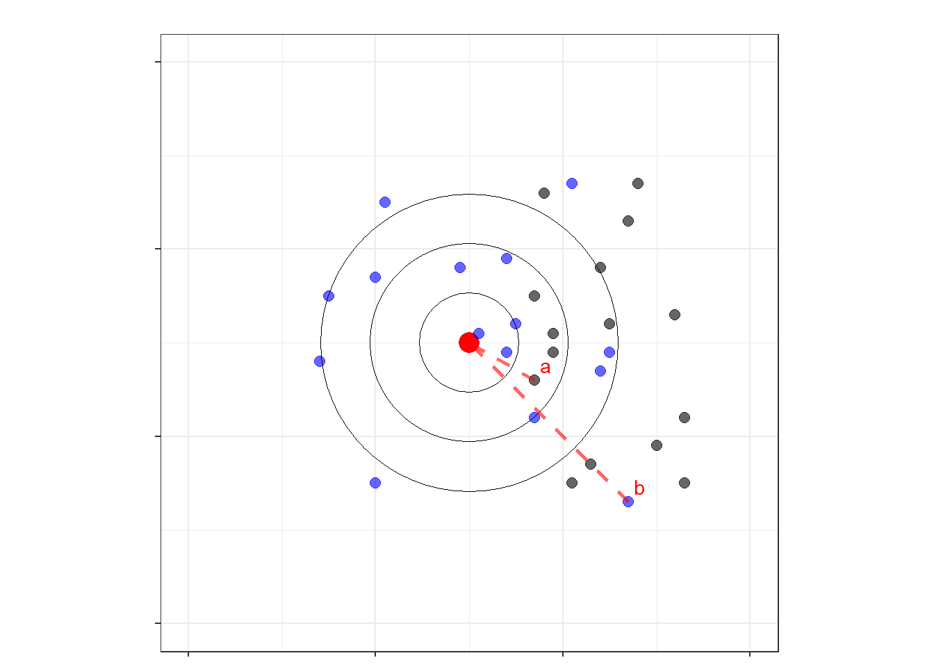 Seguindo a mesma linha de raciocínio, na figura 3 mostramos a sobreposição dos arremessos do jogador (b) em azul, e do jogador (a) em preto. Apesar do jogador (a) ser considerado o pior jogador pelo critério do vício, pois em média seus arremessos erram mais o alvo do que os outros jogadores, existem arremessos do jogador (a) que são melhores do que arremessos do jogador (b), como destacado na figura pelas linhas vermelhas achuradas.
