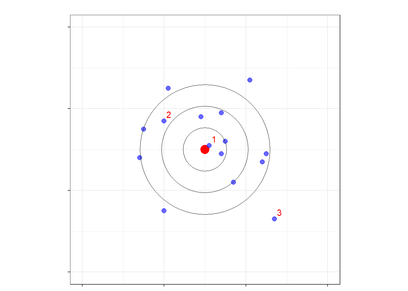 Para explicar melhor esse ponto, na figura 2 desenhamos somente o alvo do jogador (b), e destacamos \(3\) resultados de arremessos feitos por ele. O arremesso \(1\) foi o melhor deles, bem próximo ao alvo vermelho em cheio, o arremesso \(2\) foi mediano e o arremesso \(3\) foi o pior de todos os arremessos feito pelo jogador. Apesar de o jogador (b) na média de todos os arremessos acertar ao alvo, isso não garante que um arremesso específico irá acertar o mesmo, mais que isso, é possível que nenhum dos arremessos acertasse o alvo. Além disso, apesar do mesmo jogador ter feito todos os arremessos, claramente alguns arremessos são melhores do que os outros, ou seja, têm um erro observado menor.