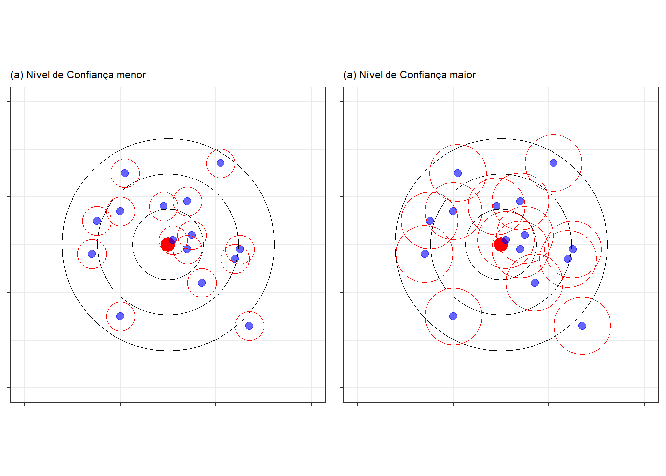 Nesse exemplo dos alvos, o comprimento do raio pode ser interpretado como o erro amostral \(d\). Ou seja, deve estar claro que dizer a margem de erro de uma pesquisa sem especificar qual foi a confiança (% de acerto) não diz qual é a precisão da pesquisa. Usualmente, a confiança é fixada em \(95%\), mas mesmo a confiança deve ser explicitamente divulgada juntamente com os resultados de uma pesquisa.