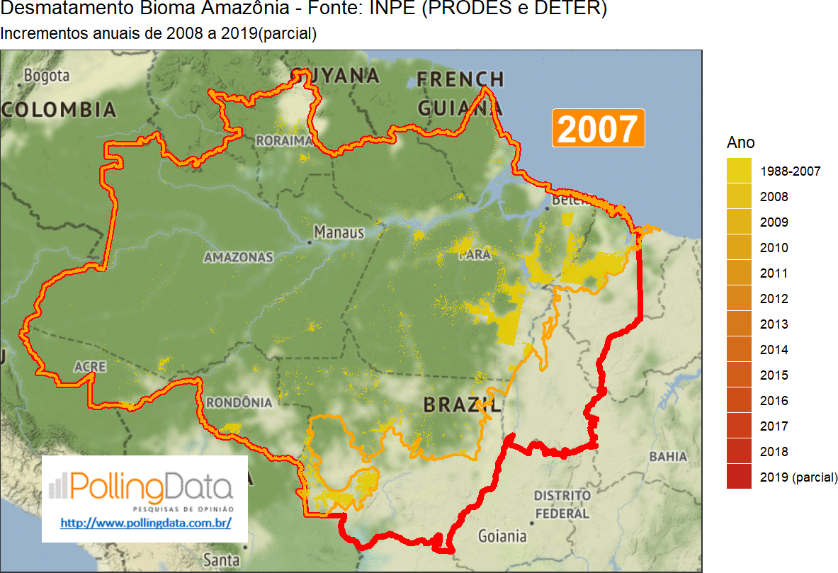 Nesse post mostraremos uma imagem animada (GIF) detalhando a evolução do desmatamento na Amazônia de 2007 a 2019. Para os interessados, também discutiremos como gerar um GIF com dados estatísticos.