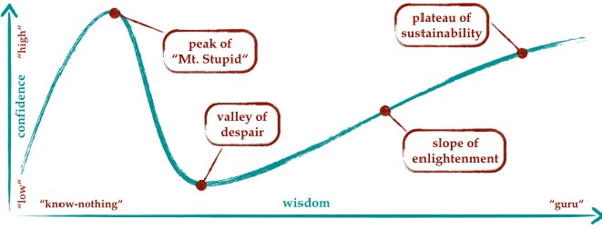 Quando você pensar suficientemente sobre o tema a ponto dele deixar de ser branco e preto, esse é um sinal de que você agora tem uma opinião mais informada sobre o tema, que não está mais sob o “efeito de Dunning-Kruger.” Esse efeito essencialmente diz que pessoas que têm pouco conhecimento sobre um assunto têm muita certeza sobre o tema. Com o tempo, quando a pessoa aprende mais sobre o assunto, ela percebe que não têm mais tanta certeza. E finalmente, depois que ela aprende muito sobre o assunto, ela começa a ter alguma certeza, mas nunca no mesmo nível de quando ela não tinha conhecimento. No gráfico abaixo o conceito pode ser mais facilmente entendido.