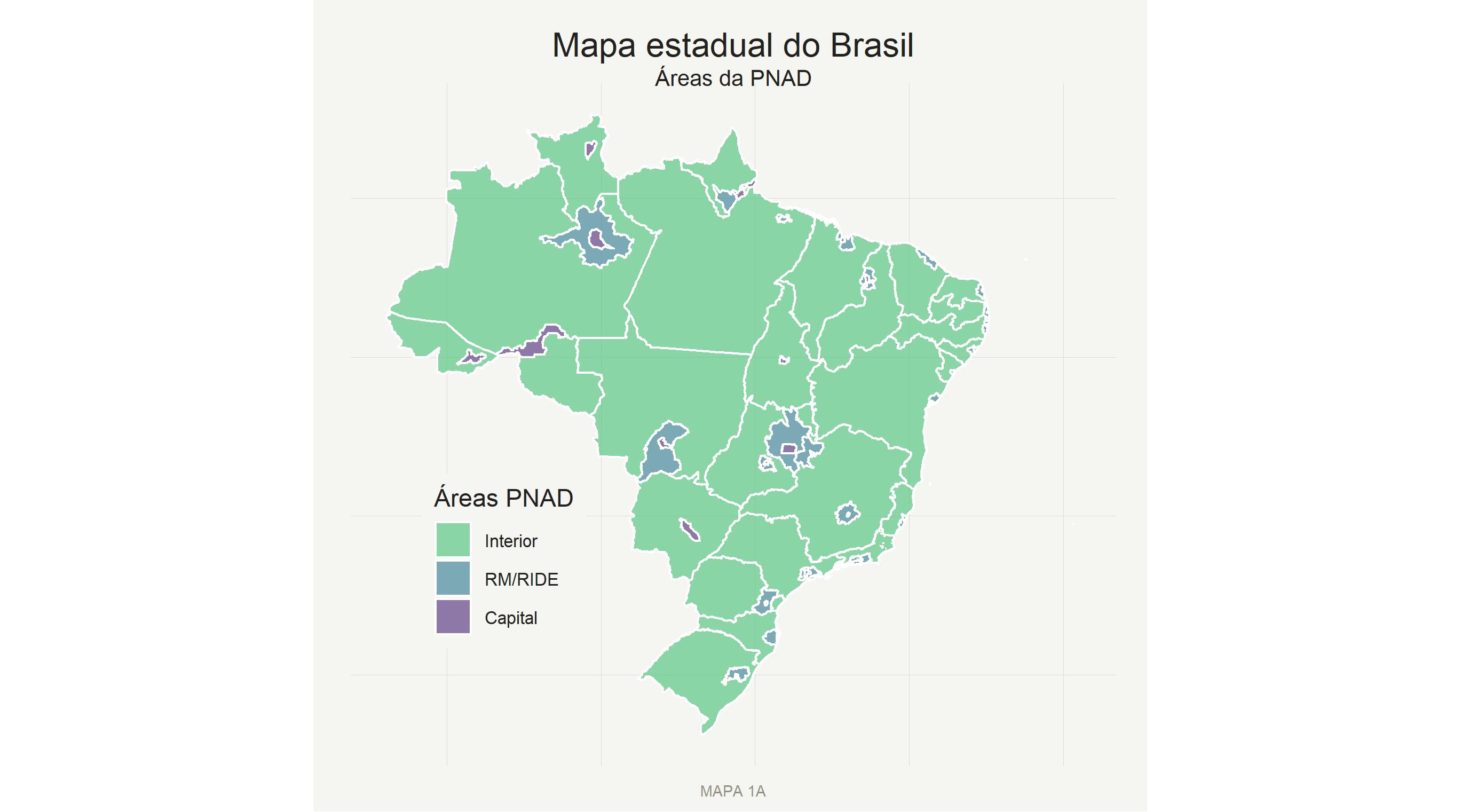 Para avaliar o potencial impacto da metodologia (e consequentemente, do modo de entrevista) na cobertura das pesquisas, utilizaremos os dados mais atuais e abrangentes para discutir a dificuldade de acesso dos institutos de pesquisas a sub-grupos da população brasileira. Para esse fim, serão utilizados os microdados da Pesquisa Nacional por Amostragem de Domicílios (PNAD), realizada continuamente pelo IBGE. A PNAD permite a leitura dos resultados em diferentes recortes analíticos e frequência (mensal, trimestral e anual), sendo assim uma das pesquisas mais importantes executadas pelo IBGE (acesse esse link para uma explicação detalhada da pesquisa). Talvez a maior restrição da PNAD seja o baixo nível de refinamento geográfico dos resultados, mostrado na figura abaixo (1A), se limitando às Capitais de cada estado, às Regiões Metropolitanas (RM)(ou Regiões Integradas de Desenvolvimento (RIDE) que contém alguma capital estadual) e o resto do estado.