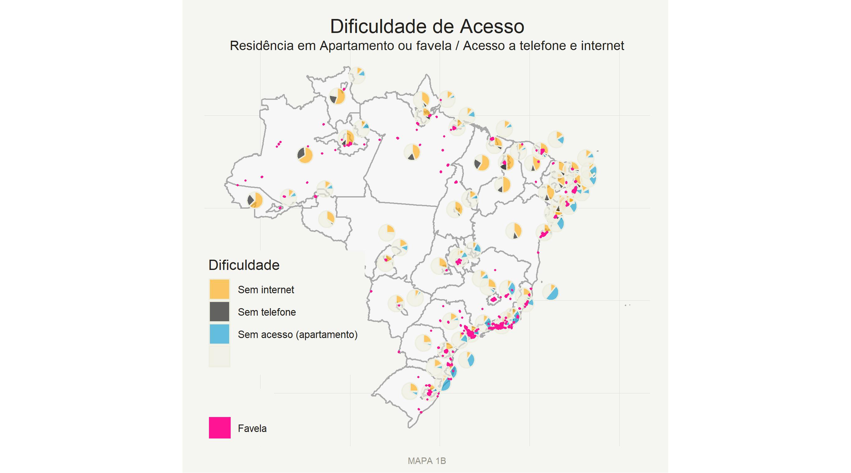 Na figura abaixo (1B) mostramos uma comparação das estatísticas relacionadas com o acesso aos respondentes por área da PNAD. Para isso utilizamos um mini gráfico de pizza para cada área, indicando três estatísticas diferentes: Sem Internet, em amarelo, que se refere ao percentual de pessoas que residem em domicílios onde nenhum morador têm acesso a internet, Sem telefone, em cinza escuro, que se refere ao percentual de pessoas que residem em domicílios onde nenhum morador têm acesso a um telefone (fixo ou celular) e Sem acesso físico(apartamento), em azul, que se refere ao percentual de pessoas que residem em domicílios classificados como apartamentos. Também mostramos no gráfico os locais onde existem favelas no país, em rosa.