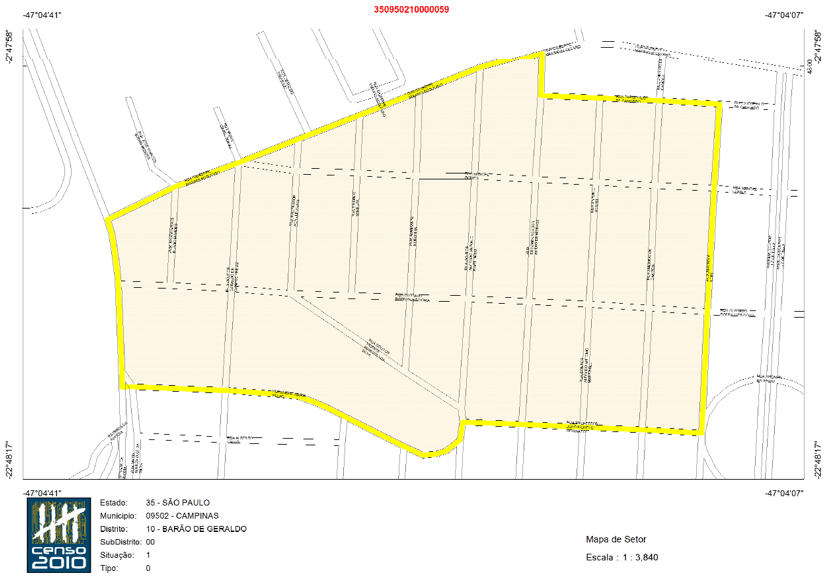 O setor censitário, que é a menor unidade geográfica para a qual existem informações oficiais do Instituto Brasileiro de Geografia e Estatistica (IBGE), possui em média 300 domicílios em áreas urbanas. Assim é possível distribuir uma amostra para pesquisas pessoais domiciliares com enorme controle sobre a dispersão geográfica. Na figura abaixo, mostro o setor censitário onde a minha residência está localizada.