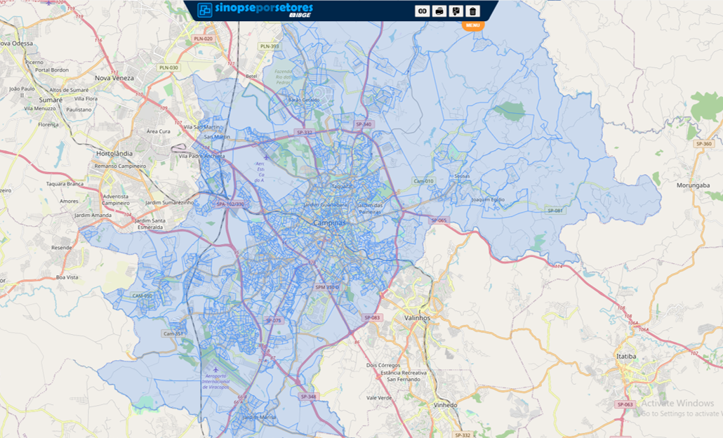 Nesse link é possível visualizar toda a malha censitária do país, que é composta por mais de 300 mil setores. Na figura abaixo, mostro a malha de setores da cidade de Campinas, onde cada setor está delimitado em azul escuro. Em pesquisas domiciliares, a estratificação geográfica pode ser feita em todos os níveis. No nível municipal, entretanto, ela depende da disponibilidade de informações da malha de setores cenistários. Sempre é possível criar regiões geográficas para estratificação agrupando setores, porém para que essas regiões tenham interesse analítico, devem estar relacionadas com áreas geo-políticas existentes na cidade.