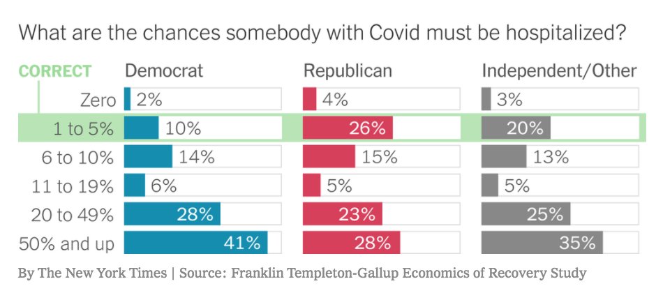 Como estamos no meio da pandemia, as informações absorvidas pelas pessoas muitas vezes são erradas e/ou fragmentadas, dificultando a tomada das decisões das pessoas com relação ao Coronavírus, pois as percepções sobre o risco associado à doença são diferentes. Como um exemplo simples, a pergunta “Qual a chance de uma pessoa ser internada dado que ela pegou Coronavírus?” foi feita pelo New York Times em uma pesquisa de opinião pública. Sem entrar em muitos detalhes de como o cálculo foi feito, a chance correta está entre 1% e 5%. Como é possível ver no gráfico abaixo, mais de 50% das pessoas responderam que o risco era maior do que 20%. Ou seja, mais de metade da população americana acredita que de cada 5 pessoas contaminadas, pelo menos 1 pessoa será internada. Isso mostra que a percepção da maioria é de que a chance de internação é de 4 a 10 vezes maior do que o risco real.